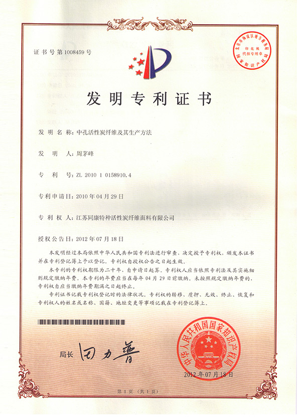 發明專利(中孔活性炭纖維及其生產方法)