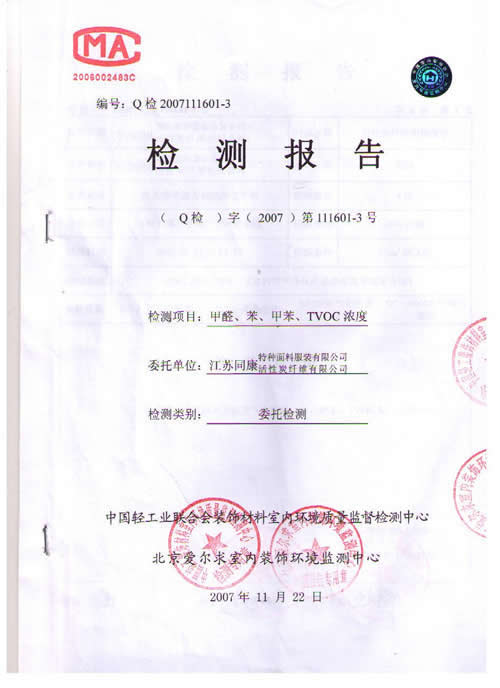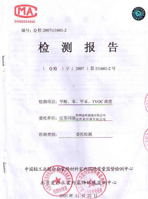 活性碳纖維靠墊檢測報告