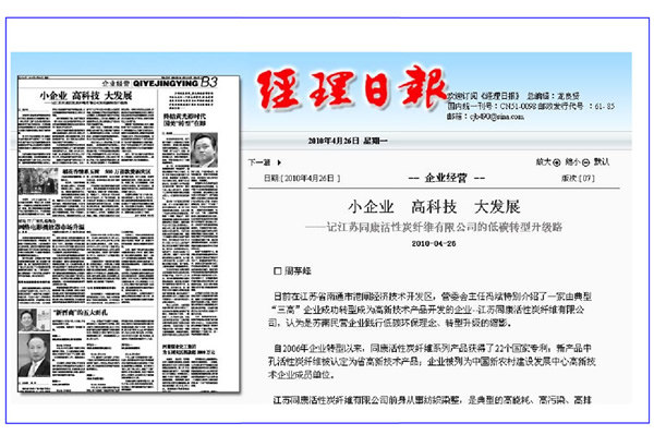 經理日報——小企業、高科技、大發展“記江蘇同康活性碳纖維有限公司的低碳轉型升級路”